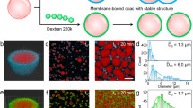 Membraneless compartments, such as those produced by complex coacervation and other forms of liquid–liquid phase coexistence, are vigorously investigated for their potential to concentrate molecules and assist reactivity20,21,22,23,24,25. Complex coacervates result from associative charge-driven assembly of oppositely charged macromolecules26. The concentrated phase can form droplets when suspended in solution. With its crowded yet hydrated interior, it is a promising protocell candidate24,27 that can amass significant concentrations of (bio)molecules22,24,28 and host enzymatic reactions20,21,23,29,30. Extant cells benefit from related functions as coacervation is implicated in forming membraneless organelles29,31,32.