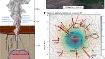 The LERZ eruption drained magma from the summit reservoir, 40 km away, at rates exceeding 100 m3 s−1, causing rapid summit deflation3. By mid-May, the summit lava lake had drained and the floor of Halemaʻumaʻu crater disintegrated in a piece-meal fashion, accompanied by several small explosive events (Fig. 1c). Summit collapses eventually involved larger portions of the caldera floor in June–July, with episodic piston-like failures that released energy equivalent to M5.2–5.4 earthquakes at intervals of 20–50 h. Significant lava effusion on the LERZ ended on August 4, roughly coincident with the end of summit collapse, although minor activity continued sporadically within the LERZ eruptive vent for the next month. Since September 2018 there has been no eruptive activity at Kīlauea, although ongoing inflationary ground deformation (Fig. 2a) and a subsurface mass increase since late 2018 indicate that magma is refilling the summit and ERZ45.