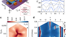 The perpendicular electric field has a profound effect on the band structure of TDBG7,8,9,10,11. As depicted in Fig. 1b, at zero electric field, the system has low-energy flat bands separated from higher energy dispersing bands by two moiré gaps. As the electric field is increased, a gap opens up at the CNP separating two flat bands. The moiré gaps close sequentially upon further increase of the electric field. In Fig. 1c, we present a schematic of the band structure at finite electric field and show the existence of Berry curvature hotspots in the flat bands. The color scale plot of calculated Berry curvature in Fig. 1d depicts the locations of hotspots in the k-space of the conduction band for K valley. Details of band structure and Berry curvature map is provided in Supplementary Note 1 (see Supplementary Figs. 1–3).