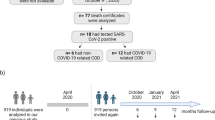 In the absence of any pilot data on SARS-CoV-2 infection rate in Gangelt, sample size calculations were based on the WHO population-based age-stratified seroepidemiological investigation protocol for COVID-19 virus infection29. According to the recommendations stated in the protocol, a size of 200 samples is sufficient to estimate SARS-CoV-2-prevalence rates <10% with an expected margin of error (defined by the expected width of the 95% confidence interval associated with the seroprevalence point estimate obtained using binomial likelihood) smaller than 10%. In order to rule out larger margins of error due to dependencies of persons living in the same household and to be able to analyze seroprevalence (i.e., infection rates) also in subgroups defined by participant age, it was planned to recruit 1000 participants living in at least 300 households. Statistical analysis was carried out by two independently working statisticians (M.S., M.B.) using version 4.0.0 of the R Language for Statistical Computing (R Core Team 2020: R: A Language and Environment for Statistical Computing, R Foundation for Statistical Computing, Vienna, Austria) and version 9.4 of the SAS System for Windows (copyright © 2002-2012 by SAS Institute Inc., Cary, NC, USA). Participants with a missing anti-SARS-CoV-2 IgG or PCR test result were excluded from analysis, as they were not evaluable for infection status. Participants that did not report a previous positive PCR test result were documented as PCRrep negative. Missing and unknown values in the co-morbidity and symptom variables were not imputed, as listwise deletion reduced sample sizes by less than 5%. Age groups were formed according to the classification system of the Robert Koch Institute (RKI), which is the German federal government agency and research institute responsible for infectious disease control and prevention.