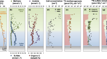 Deep shotgun metagenome sequencing was performed for sediments based on porewater sulfate concentrations and other geochemical data (Table 2 and Supplementary Fig. 1). Alpha diversity was calculated using single-copy marker genes from the metagenomic datasets34, and cell densities were estimated via quantitative PCR of bacterial and archaeal 16S rRNA genes. Differences in diversity and cell density were related to the availability of migrated thermogenic hydrocarbons and sulfate (Table 1 and Supplementary Table 1). Overall, the surface sediment and near-surface sediment (20 cmbsf) harbored the most diverse communities (Shannon index = 6.70 and 5.58) and highest bacterial cell density (2.64 and 2.22 × 109 16S rRNA genes g−1). In contrast, the sediment at 60 cmbsf harbored the most distinct communities (Fig. 2a), the lowest microbial diversity (3.60), and the highest archaeal cell density (1.23 × 109 16S rRNA genes g−1). Deeper sediments (100–250 cmbsf) were compositionally similar to each other and harbored moderately to highly diverse and abundant communities (Table 2 and Fig. 2a).