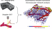 For 3D blood flow speed measurement presented in Fig. 5, blood vessel segments were hand-traced over the average intensity projection of 1-min-long 99 Hz datasets (two 208 µm × 208 µm × 80 µm volumes 0–80 µm below top pia surface in two mice; two 416 µm × 416 µm × 80 µm volumes 0–80 µm and 100–180 µm below the top pia surface, respectively, in two mice). Raw Bessel images were then resliced along the length of blood vessel segments and plotted in time as kymographs. Because RBCs excluded fluorescent dye and appeared as dark shadows, they generated diagonal dark streaks in kymographs21. We rejected from analysis blood vessel kymographs with little to no RBC streaks visible above the background fluorescence. We measured the 3D lengths of blood vessel segments from skeletonized Gaussian structural data and then nonlinearly transformed the horizontal axes of the kymographs from 2D Bessel projection length to 3D Gaussian structural length for further analysis. We adapted an automated method developed by Chhatbar and Kara43 to measure the slope of RBC streaks using Sobel filtering and iterative Radon transforms and calculated blood flow speed every 50-frame (0.5 s) kymograph segment. We further rejected from analysis blood vessel segments that had more than one-third of its time trace showing very high (>5 mm/s) or reversed (<0 mm/s) flow speeds. Sizes of blood vessel segments were measured by taking the FWHM of a representative hand-drawn line intensity cross-section of each segment from the average intensity projection of the Bessel dataset.