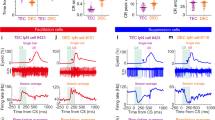 Single-channel recordings and Purkinje cell complex spikes were analyzed by using in-house developed code SpikeTrain (Neurasmus) in Matlab17,19. Raw recordings were band-pass filtered at 300–3000 Hz to subtract noise and field potential signals. We extracted spike events with amplitudes that crossed the threshold at three SDs of the baseline noise. We performed additional manual waveform sorting to Purkinje cell complex spikes based on the distinct features of an initial spike followed by high-frequency spikelets. Neurons from multichannel recordings were sorted with JRCLUST81, and all spike time was stored for further analysis. In order to determine the cell modulation is response to CS, only cells with more than 20 CR trials were included in the dataset. Peristimulus time histograms (PSTHs) of well-isolated units were constructed by superimposing the CS onset-aligned spike time in a shifting window (50 ms window size, 5 ms increment) which shifted from 500 ms before CS and onward, and were expressed as frequency. We conservatively performed CR modulation detection within 50–200 ms after CS onset due to the fact that the shifting window for PSTH construction went across CR and UR in the last 50 ms of CS. Baseline firing rate was calculated as the mean frequency in a 500 ms window prior to the CS onset. We determined firing rate changes in response to CS by subtracting the baseline firing rate from the frequency within 50–200 ms after CS onset. Cells with average firing rate changes (50–200 ms) more than three SDs of the baseline frequency were considered modulating in response to CS. We then discriminated the direction of modulation by linearly fitting the PSTH of spike frequency within the 50–200 ms window. Fittings with positive slopes were considered as facilitation, whereas with negative slopes were considered as suppression. UR modulation was determined within the first 100 ms after US. As previously described17, spike rate change more than 5 Hz after US was considered as US-related modulation,.