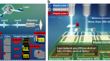 We used the Ti:sapphire laser regenerative amplifier system, which can generate 1000 single pulses per second. In theory, a single MSC could be fabricated in only 1 ms. The actual processing speed observed was more than 3000/min, which is tens or hundreds of times more efficient than previously reported processes for fabricating MSCs31,32,33,34,35,36. The SSFL also has the advantages of high machining accuracy and near faultless processing consistency, enabling rapid and large-scale application. As illustrated in Supplementary Table 1, our SSFL has unprecedented fabrication efficiency and fabricated high-resolution and micron-scale supercapacitors (a detailed manufacturing and a processing video are included in Supplementary movie).