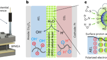 The galvanostatic EIS analysis is performed at three current densities such as 30, 40 and 50 mA cm−2 for both the SCBMs and the commercial FumaTech FBM membranes (for comparison). The value of λ is calculated using three sets of the frequencies and corresponding imaginary impedance values at the apex point of each Bode curve of the SCBMs (Fig. 4a) and FBMs (Supplementary Fig. 7a) using a simplified mathematical expression (Eq. 1 in Methods section)39. During repeated EIS analysis, we found a linear relationship of the λ in SCBMs (λSCJ: 83.4 < 90.6 < 93.1 nm) and λ in FBMs (λFBJ: 10.4 < 11.7 < 13.6 nm) with the applied current densities (30 < 40 < 50 mA cm−2). Herein, almost 89.1 nm junction region is electro-ionically neutral from ~300-nm-thick shielded catalytic junction (visible in the SEM cross-sectional image, Fig. 4b) containing PANI shields, catalyst and penetrated QPPO (see the distribution of bromine, a representative element of QPPO, in Supplementary Fig. 5). However, ~11.9 nm is the electro-ionically neutral catalytic junction in FumaTech FBM (Supplementary Table 4). A similar increasing trend in the junction capacitance (CSCJ: 18.7 < 21.1 < 21.9 µF cm2) and (CFBJ: 4.8 < 4.9 < 5.2 µF cm2) at increased current densities was obtained from the EEC modelling and the data simulation (fitting accuracy: 97% and χ2 value <10−4). The increase in λ (thickness of the electro-neutral junction region) and C (junction capacitance) with the increased current densities are likely due to a voltage-dependent change in ion concentrations during a WD process inside the membrane junction. However, comparatively larger λSCJ (89.1 nm) and CSCJ (20.6 µF cm2) predict spacious junction of the SCBMs than FumaTech FBM (λFBJ: 11.9 nm and CFBJ: 4.9 µF cm2). This junctional characteristic is highly beneficial for uptaking large feed water to avoid membrane dehydration and enabling fast water dissociation (Fig. 5c and Supplementary Fig. 11b)40. The electro-ionically insulated large region is also possible due to the porous morphology of the shielded catalytic junction (smaller Q-nPCI: 0.603, Supplementary Table 5). The small value of cumulative resistance of the SCBMs (RC+A+BLs: 0.906 ± 0.006 Ω cm2) compared with the FumaTech FBM (RC+A+BLs: 1.41 ± 0.01 Ω cm2) is also beneficial for enabling the quick supply of feed water to the junction and withdrawal of H+/OH− ions across the C/AEL of SCBMs. Another most important junctional characteristic is the water dissociation reaction resistance (RSCJ) and its significant decrease with increase in current densities such as 0.679 Ω cm2 at 30 mA cm−2 to 0.627 Ω cm2 at 40 mA cm−2 (7.66% decrease) and 0.549 Ω cm2 at 50 mA cm−2 (12.44% decrease) dictates an enhanced rate of water dissociation in SCBMs at high current densities (second Wein effect)33,34,35. Moreover, a comparatively smallest resistance (RCJI: 1.961 Ω cm2, RPCI: 1.293 Ω cm2 and RJAI: 1.779 Ω cm2) and largest admittance (Q-YCJI: 0.002 S cm−2 sn, Q-YPCI: 0.043 S cm−2 sn and Q-YJAI: 1.592E-4 S cm−2 sn) of the polyaniline-catalysts-interface (PCI) at both the 1 and 3 mA cm−2 predict fast ionic transportation and WD within the junction due to the abundance of PANI and the catalyst (Fig. 4b, Supplementary Fig. 8 and Supplementary Table 5). These results are theoretically in accordance with Faraday’s law of charge conduction (i.e., more the charge carriers, less the charge transfer resistance)7,41. Briefly, the EIS analysis preliminary validates the electrochemical excellence of the SCBMs compared with the commercial FumaTech FBMs such as large water uptake, fast water dissociation, and quick withdrawal of the produced H+/OH− ions at increased current densities.