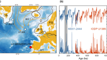 To further evaluate %C37:4 as a sea ice proxy within a paleoceanographic context, we compared %C37:4 records with the widely applied sea ice proxy IP25 and coarse fraction contents (% of grain size > 63 μm) in the Svalbard area during the past ca. 14.5 kyr (Figs. 4 and 5). IP25 is a C25 isoprenoid lipid synthesized by certain Arctic sea ice diatoms and is deposited in underlying sediments following ice-melt in spring53,54,55. Coarse sediment fraction at this site is largely composed of lithic grains and foraminifera, reflecting sea ice formation off the western Barents shelf56. The Fram Strait is the major gateway between the North Atlantic and the Arctic Ocean, and sea ice distribution in our study area is highly sensitive to surface temperature variability in modern time57. Over longer timeframes, such as the Holocene, variations in sea ice extent in the Fram strait, the Greenland Sea, and the northern Barents Sea co-occurred with changes in Northern Hemisphere solar insolation and changes in Greenland air temperature58,59,60,61,62. Marine sediment core M23258-256,63 (74.99°N, 13.97°E) is located close to the modern maximum winter sea ice extent in the northeastern Norwegian Sea where temporal variations of sea ice conditions have been identified64. Alkenones were not detected prior to 14.1 kyr BP in M23258-2, likely due to seasonally extended sea ice cover limiting productivity. The general trend of %C37:4 from M23258-263 is in direct agreement with inferred-temperature trends from the δ18O values of Renland ice core located in east Greenland65, with increasing %C37:4 corresponding to decreasing temperature, and is positively correlated with IP25 concentration and coarse fraction content in M23258-2 (Supplementary Fig. 7). The high values of %C37:4 in both M23258-2 and JM09-020-GC52 (76.31°N, 19.70°E) located in the glacial trough of Storfjordrenna during the Bølling–Allerød (13.95–12.8 kyr BP) may represent partial sea ice cover and a retreating ice edge; high coarse fraction content during this time in M23258-2 suggests rapid breakup of the Svalbard–Barents Sea ice sheet. The highest peak in %C37:4 in M23258-2 occurs at the beginning of the Younger Dryas (YD, ~12.8 kyr BP), indicating an expansion of sea ice. This is in agreement with increases in the coarse grain-size fraction and IP25 from M23258-2 and increases in IP25 at nearby site JM09-KA11-GC66 (74.87°N, 16.48°E). The gradual decrease in %C37:4 observed in M23258-2 and JM09-020-GC after the termination of YD (~11.7 kyr BP) is coincident with increasing Northern Hemisphere summer insolation and temperature. Low %C37:4 in M23258-2 and the closely adjacent core SV0467 (74.957°N, 13.899°E) suggests that sea ice extent retreated and was present in low concentrations at these sites between 10.8 and 4 kyr BP during the Holocene Thermal Maximum, while the fluctuating %C37:4 in JM09-020-GC suggests a variable ice-edge condition at Storfjordrenna during this period. %C37:4 in M23258-2 increased after ca. 4 kyr BP indicating a slight expansion of the sea ice margin during the neoglacial cooling period in the Northern Hemisphere, as the coarse fraction contents in this core also increased, reflecting sediment injections caused by cascades of dense brine water down the Barents shelf induced by seasonal sea ice56. IP25 in M23258-2 is, however, absent (or below detection limit) during this time period. The return to partial seasonal sea ice cover during neoglaciation is also evident in the rapid IP25 increase in the Fram Strait60 (MSM5/5-723-2; 79.16°N, 5.33°E) and northern Barents Sea records68 (NP05-11-70GC; 78.40°N, 32.42°E), as well as the re-emergence of IP25 in JM09-KA11-GC.