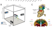 We recorded neural activity from two male non-human primates (macaca mulatta), Monkey J and Monkey C. No statistical procedures were used to predetermine the sample size, but our sample size was similar to those reported in previous publications9,10,11,19,22. Both monkeys performed a 3D reach-and-grasp movement for liquid reward in a 50 cm × 50 cm × 50 cm workspace and continuously in time. Monkeys naturalistically reached for an object positioned on a wand, grasped the object, then released the object and returned their hand to a natural resting position (Fig. 1a). The wand was always visible to the monkeys and was continuously moved by the experimenter to random diverse locations that spanned a large spatial area in front of the monkeys (Supplementary Table 1). Also, monkeys performed the task continuously in time. Our experimental set-up allowed each monkey to choose how to reach-and-grasp the object, lacked instructions needed to isolate reach-and-grasp movement components and, in fact, lacked overt movement instructions in general (see Results). All surgical and experimental procedures were performed in compliance with the National Institute of Health Guide for Care and Use of Laboratory Animals and were approved by the New York University Institutional Animal Care and Use Committee. A total of 23 retroreflective markers were attached on each monkey’s right arm (on skin) and monitored using infrared and near-infrared motion capture cameras (Osprey Digital RealTime System, Motion Analysis Corp., USA) at a sampling rate of 100 frames s−1. We labeled 3D marker trajectories for each marker on the arm and hand (Cortex, Motion Analysis Corp., USA) and solved for the joint angles using a NHP musculoskeletal model44 that allowed us to compute inverse kinematics (SIMM, MusculoGraphics Inc., USA). The joint angles on the arm are: shoulder elevation, elevation angle, shoulder rotation, elbow flexion, pro supination, wrist flexion, and wrist deviation44. We tracked 20 finger joint angles for Monkey J (prox flexion, prox abduction, mid flexion, and distal flexion for each finger). For Monkey C, we tracked 18 finger joint angles as two of the finger joint angles (middle distal flexion and ring distal flexion) were missing due to technicalities. For the end-point hand kinematics, we use the position and velocity of the wrist marker in the x, y, and z directions. On each frame, motion capture camera data acquisition was synchronized to the neural recordings using a synchronization trigger pulse.