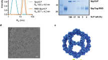 The RBD (amino acids (aa) 319-591) of the SARS-CoV-2 spike protein (Sequence ID: QIA20044.1) was genetically fused at either the N- or C-terminus to the split-protein Catcher, used for conjugation to the CLP (Fig. 1a, c). The two RBD antigens (termed RBDn and RBDc, respectively) were expressed in Schneider-2 (ExpresS2) insect cells, yielding approximately 8 mg/L for transient cell line and 50 mg/L for stable cell line. RBDc appeared to be a high-quality monomeric protein (supplementary Fig. 1), and the same was true for RBDn. The split-protein peptide Tag was genetically fused to the coat protein of the AP205 and expressed in E. coli with yields in the gram per liter range. The recombinant Tag-AP205 protein spontaneously forms CLPs presenting the peptide Tag on its surface23 (Fig. 1c). Mixing of Catcher-RBD and Tag-CLPs results in the formation of a covalent isopeptide bond between the Catcher and Tag42,43,44,45,46,47. Covalent coupling of the RBD antigens to the CLPs was confirmed by SDS-PAGE analysis, by the appearance of a protein band of 60 kDa, corresponding to the added size of the RBD antigen (43 kDa) and Tag-CLP subunit (16.5 kDa) (Fig. 1b, lane 2 and 5). The samples were subjected to a stability spin test (16000 g, 2 min), showing no loss of the coupling band (60 kDa), indicating that the vaccines are stable and not prone to precipitation or aggregation (Fig. 1b, lane 3 and 6). The coupling efficiency of the reactions were assessed by densitometry to be approximately 33% for the RBDc and 45% for the RBDn vaccine. For the RBDc-CLP and RBDn-CLP vaccines, this means that each CLP (build from 180 subunits) was decorated with ~60 RBDc and ~80 RBDn antigens, respectively. A higher coupling efficiency could not be obtained by increasing the molar excess of antigen, indicating steric hindrance on the CLP surface. The Tag/Catcher mediated conjugation results in unidirectional display of the RBD antigens, thus the positioning of the Catcher on the RBD could affect how the antigen is oriented on the CLP surface (Fig. 1c). However, structural modelling of the RBD-CLP vaccine suggests, that both the N- and C-terminus of the RBD antigen are in close proximity to the CLP surface (Fig. 1d), and that RBD has a similar orientation whether the catcher is attached N- or C terminally. In addition, the modelling suggests that the ACE2 binding epitope on RBD will be accessible for immune recognition on the CLPs (Fig. 1d). After removal of unbound RBD, the integrity and aggregation of the vaccines were analyzed by transmission electron microscopy (TEM) and dynamic light scattering (DLS). TEM analysis confirmed the presence of intact CLP-antigen complexes of the expected size for both vaccines (Fig. 2a–c). However, DLS analysis showed that the RBDc-CLP vaccine had propensity for aggregation, as indicated by a high polydispersity (Pd% ~30) and showed evidence of larger aggregates (Fig. 2b). In contrast, the RBDn-CLP vaccine showed little aggregation with a single peak of the expected size of monodisperse CLP antigen complexes (~50 nm) (Fig. 2d).