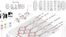 Experimentally, we build a small-scale, four-channel system with four PMMCs to represent a 2 × 2 kernel matrix, as shown in the optical image in Fig. 3b. As a demonstration, we perform the convolution of a 256 × 256 8-bit grayscale image of a cameraman (Fig. 3c) to detect its edge features. As shown in Fig. 3b, the TE0 mode output coming from all the PMMCs is combined using on-chip Y-junctions, while the TE1 mode output power is combined off-chip because the same ports are used to program the PMMCs optically. Because combining four incoherent sources using Y-junctions will inherently reduce the power by a factor of 4, we rescale the measured TE0 mode power by this factor when calculating the power differences between two modes. To detect vertical and horizontal edges, kernel matrices as in the right column of Fig. 3d, e are used, and so are the PMMCs programmed. Take the vertical edge detection for example, the kernel is set to be \(\left[ {\begin{array}{*{20}{c}} { - 1} & 1 \\ { - 1} & 1 \end{array}} \right]\) so to compute the discrete first-order derivative, \(X_{i + 1,j} + X_{i + 1,j + 1} - X_{i,j} - X_{i,j + 1}\), where i, j are the indices of the input image matrix. Each kernel element Wij is stored as the mode contrast value Γ in the corresponding PMMC, with Wij = 1(−1) corresponding to the fully aGST (cGST) phase (see Supplementary Note 9 for a more detailed description about the operation procedure). The computed images after convolution without any post-processing are shown in the left column of Fig. 3d, e, for horizontal and vertical edge detection, respectively. The two images are then added to produce the right image in Fig. 3b, which highlights silhouettes of the objects with sharp edges such as the cameraman and the buildings in the original image, while suppressing smooth features such as the sky and the water. The optically computed edge detection image agrees very well with the calculated result using conventional image processing algorithms (see Supplementary Fig. 16). This result verifies the capacity and fidelity of optical convolution performed with the PMMC-based photonic kernel, which is a prerequisite for an OCNN.
