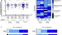 To determine the role of Matrix-M in generating T cell responses, we immunized groups of mice (N = 6/group) with 10 μg NVX-CoV2373 alone or with 5 μg Matrix-M in a two-dose regimen spaced 21 days apart. Antigen-specific T cell responses were measured by ELISpot and intracellular cytokine staining (ICCS) from spleens collected 7 days after the second immunization (study day 28) (Fig. 6a). The number of IFN-γ-secreting cells after ex vivo stimulation increased sevenfold in spleens of mice immunized with NVX-CoV2373/Matrix-M compared to NVX-CoV2373 alone as measured by the ELISpot assay (Fig. 6b). In order to examine CD4+ and CD8+ T cell responses separately, ICCS assays were performed in combination with surface marker staining. Data shown were gated on the CD44hi CD62L− effector memory T cell population. Importantly, we found the frequency of IFN-γ+, TNF-α+, and IL-2+ cytokine-secreting CD4+ and CD8+ T cells was significantly higher (p < 0.0001) in spleens from the NVX-CoV2373/Matrix-M-immunized mice compared to mice immunized without adjuvant (Fig. 6c, d). Further, we noted the frequency of multifunctional CD4+ and CD8+ T cells, which simultaneously produce at least two or three cytokines, was also significantly increased (p < 0.0001) in spleens from the NVX-CoV2373/Matrix-M-immunized mice (Fig. 6c, d). Immunization with NVX-CoV2373/Matrix-M resulted in higher proportions of a multifunctional phenotype within both CD4+ and CD8+ T cell populations. The proportions of multifunctional phenotypes detected in memory CD8+ T cells were higher than those in CD4+ T cells (Fig. 6e).