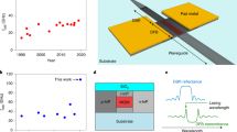 From the measurements we can extract the modulation height attainable on an incoming laser beam with a +6 V maximum bias with this specific device. The modulation height is defined as \(\min \left(\left| \frac{R_{{\mathrm{NB}}}-R_{{\mathrm{B}}}}{R_{{\mathrm{B}}}}\right| , \left| \frac{R_{{\mathrm{NB}}}-R_{{\mathrm{B}}}}{R_{{\mathrm{NB}}}}\right| \right)\): it is plotted in Fig. 2(c) in the 800–1100 cm−1 range for both B = 6 V and B = 3 V. It shows that a contrast above 10% can be obtained in a few frequency ranges. In particular, a contrast between 20% and 30% can be obtained around 1030 cm−1 (λ ~ 9.70 μm). This frequency is covered by our tunable commercial QC laser (shadowed orange region in Fig. 2(c)).