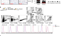 Tumors were mechanically dissociated and digested with 1-mg mL−1 collagenase A and 0.1-mg mL−1 DNase I for 20 min at 37 °C. Then single-cell suspensions of tumors were prepared by passage through 100 µM cell strainers (BD Biosciences). Surface staining was performed by incubating cells on ice, for 20 min, with saturating concentrations of labeled Abs in PBS, 5% FCS, and 0.5% EDTA. After blocking Fc receptors using anti-CD16/32 antibodies, cells were stained with the appropriate combination of antibodies (see Supplementary Table 1). The transcription factor staining Buffer Set (eBioscience) was used for the FoxP3 staining. For intracellular cytokines, staining was performed after stimulation of single-cell suspensions with Phorbol 12-myristate 13-acetate (PMA at 50 ng mL−1, Sigma), ionomycin (0.5 μg mL−1, Sigma) and 1 μL mL−1 Golgi Plug™ (BD Biosciences) for 4 h at 37 °C 5% CO2. Cells were incubated with Live/Dead Near-IR stain (Invitrogen), according to the manufacturer’s protocol prior to Ab surface staining. Then, intracellular staining was performed using Cytofix/Cytoperm™ kit (BD biosciences) following the manufacturer’s instructions. The production of IFN-γ and IL-10 was simultaneously analyzed in CD45+, NK, CD4+ T, or CD8+ T cells. Data files were acquired and analyzed on Aria III using Diva software (BD Biosciences) or on the CytoFlex LX (Beckman Coulter) and analyzed using FlowJo software (LLC). Gating strategies are shown in Supplementary Fig. 12.