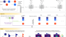 More specifically, we compared networks G and G′ differing by a single catalytic species denoted a (networks connected by a curved line in Fig. 1d). Denoting V the set of species common to G and G′, we define the network perturbation as pG→G′ = \(\mathop {\sum}\nolimits_{v \in V} {\left| {y_v^\prime - y_v} \right|}\) where yv and \(y_v^\prime\) are the respective fractions of species v in G and G′, both normalized within V (Fig. 2b). By definition, the maximum is \(p_{G \to G{\prime}} = 2\) and is reached for a full switch in species composition, for example going from (yu, yv) = (0, 1) to \((y_u^\prime ,y_v^\prime ) = (1,0)\) in \(V = \{ u,v\}\). Averaging for each network the effect of all perturbations (green line, Fig. 2c) revealed large differences from networks that are marginally (mean\(\bar p_{G \to G^{\prime}} = 0.1\)) to strongly (\(\bar p_{G \to G} = 1.5\)) susceptible to species addition. Furthermore, we observed that high-yield networks tend to display small perturbation values, implying a trade-off between growth and variation (Fig. 2d, Supplementary Fig. 6e).
