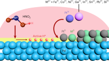 PtPdM (M = Cu, Ni, Co) catalysts were synthesized by the wet chemical method described previously32. Briefly, PtPdM (M = Cu, Ni, Co NPs were synthesized by adding a total of 1 mmol with a specific feeding ratio (see Fig. 1a and Supplementary Fig. S6a) of platinum(II) acetylacetonate (Pt(acac)2), palladium(II) acetylacetonate (Pd(acac)2), and copper(II) acetylacetonate (Cu(acac)2), or nickel(II) acetylacetonate (Ni(acac)2), or cobalt(III) acetylacetonate (Co(acac)3) to a 125 mL benzyl ether solution. This solution was continuously stirred and purged with N2 throughout the addition of the reagents. A controlled amount of capping agent (5 mmol), equally divided between 2.5 mmol oleylamine and 2.5 mmol oleic acid, was added. 2 mmol 1,2-hexadecanediol was added as reducing agent. Rapid mixing of the solution ensured uniformity. The solution was then heated to 105 °C, upon which N2 purging was ceased. The solution was brought to a final temperature of 220–260 °C, in which the solution experienced several color changes before turning completely black, and then allowed to reflux at that temperature for 30 min. Once the solution had cooled to room temperature, the NPs were collected by adding ethanol and centrifuging for 10 min to encourage precipitation. The precipitated NPs were suspended in hexane to create an NP ink. Mixing of NP ink and Vulcan carbon (XC–72) by overnight stirring generated the catalysts. These catalysts were thermally treated: first under N2 to 120 °C for 10 min, and then under O2 (20% O2 balanced by N2) to 260 °C for 1 h, and then under H2 (15% H2 balanced by N2) to 400 °C for 2 h in order to remove the surfactants and anneal the catalysts, which generated the as-prepared catalysts to be used for this study. This process is scalable, as demonstrated recently in our lab for making tens of grams of catalysts in one batch.