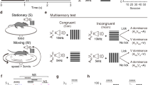 To further demonstrate that the freezing-escape behavior was in response to a looming object, we redesigned sound stimuli to simulate a receding object (Fig. 1d–e). For the decrescendo (i.e. receding) stimulus with 20 dB SPL background, the intensity of noise decreased linearly from 70 to 20 dB SPL within 0.4 s, opposite to the crescendo stimulus (Fig. 1e). In a group of mice, we tested both the crescendo and decrescendo stimuli, with the two types of stimuli randomly ordered and presented with an interval of at least 48 h (see “Methods”). In contrast to crescendo stimuli, decrescendo sounds failed to induce a reliable freezing or escape behavior (Fig. 1f–g), as shown by the reduced freezing duration (Fig. 1h, Decr), normalized top speed (Fig. 1i) and nest time (Fig. 1j). Decrescendo stimuli with a high-level background (70 dB SPL) also failed to produce a reliable defensive response (Supplementary Fig. 3). These results indicate that mice are much less fearful to decrescendo than crescendo stimuli. Therefore, the defense behaviors elicited are specific to sounds mimicking approaching objects.