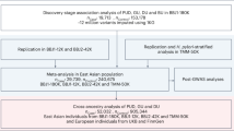We performed case–control GWAS analyses using BOLT-LMM106 with sex, age and 20 ancestry principal components (PCs) fitted as covariates. 543,919 SNPs generated by linkage disequilibrium (LD) pruning (r2 < 0.9) from HapMap3 SNPs were used to control for population structure and polygenic effects, including genetic relatedness between individuals. The effect size (β) from BOLT-LMM on the observed 0–1 scale were transformed to odds ratio (OR) using the following equation107: \({\mathrm{OR}} = \frac{{\left( {k + \beta \left( {1 - p} \right)} \right. \times \left( {1 - k + \beta p} \right)}}{{\left( {k - \beta p} \right) \times \left( {1 - k - \beta \left( {1 - p} \right)} \right)}}\), where k is the proportion of sample that are cases, and P is the allele frequency in the full UKB European cohort. The standard error (s.e.) for OR were then calculated based on the OR and P value from the initial GWAS using the formula \({\mathrm{s}}.{\mathrm{e}}. = \left| {\frac{{\ln ({\mathrm{OR}})}}{{{\mathrm{{\Phi}}}^{ - 1}\left( {\frac{{\mathrm{P}}}{2}} \right)}}} \right|\). A total of 8,546,065 SNPs with minor allele frequency (MAF) > 0.01 were analysed. Independent trait-associated SNPs were generated using GCTA-COJO34,35 analyses. The genotype data (8,546,065 SNPs with MAF > 0.01) of 20,000 random sampled unrelated European individuals were used to provide a LD reference. Due to the complexity of major histocompatibility complex (MHC) region (25–34 Mb), only the most significant SNP across that region was reported. Regional visualization plots were produced using LocusZoom108. The genomic inflation factor (λGC) was also reported for each phenotype. We used PUD and IBS GWAS summary statistics37 from the GERA36 cohort for validation look-up of the UKB PUD and IBS genome-wide significant SNPs, respectively. We applied RPower package109 to calculate power for UKB PUD and IBS genome-wide significant SNPs give GERA sample size for each trait. We also conducted pleiotropy (SNP associated with multiple traits) analysis. Briefly, we downloaded published GWAS associations from the GWAS Catalog39 on April 6th 2020. For each of PUD, GORD, PG+M, and IBS associated SNPs in our study (index SNP), we first selected SNPs from the GWAS Catalog within a ±1000 kb window size of the index SNP. We then selected the GWAS Catalog SNPs significantly associated (P < 5.0E−8) with either mental health-related traits or digestive diseases. We reported a pleiotropic association if selected GWAS Catalog SNPs are in LD (r2 > 0.1) with the index SNP. Similarly, for IBD-associated SNPs in our study, we checked whether significant association (P < 5.0E−8) have been reported for inflammatory bowel diseases (including the subtypes) using the downloaded GWAS Catalog data. GWASs for sensitivity phenotypes of each of PUD, GORD, IBS, and IBD were conducted. We also conducted GWASs for the three subgroup phenotypes of each of PUD, GORD, and IBS for further post-GWAS analyses, following the same procedures mentioned above. Given the sex specific effect of rs10512344 on IBS, we further conducted sex-specific GWAS on IBS. To explore the specificity of PUD-associated SNPs, we conducted a multitrait conditional and joint (mtCOJO)37 analysis to condition the PUD GWAS results on GORD GWAS summary statistics and check whether the original PUD-associated SNPs remain significant. We used the GENE2FUNC of FUMA pipeline38, together with GTEx 8th version gene expression data60, to investigate whether the genes surrounding PUD-associated SNPs are overexpressed in any specific tissue.
