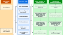 Following the estimation of \(h_{{\rm{SNP}}}^2\), we partitioned the SNP-based heritability by genomic features111. Briefly, in this method111, genetic variants are assigned into 53 functional categories using 24 publicly available annotation data sets, such as UCSC coding, UTRs, promoter and intronic regions112, conserved regions113 and functional genomic annotations constructed using ENCODE114 and Roadmap Epigenomics Consortium66 data. The method evaluates the contribution of each functional category to the overall \(h_{{\rm{SNP}}}^2\) of a trait. A category is enriched for \(h_{{\rm{SNP}}}^2\) if the variants with high LD to that category have elevated χ2 statistics, compared to the expectation given the number of SNPs in the category. In another analysis, genetic variants were annotated to histone marks (H3K4me1, H3K4me3, H3K9ac, and H3K27ac) by cell type specific classes and these annotations were allocated to ten groups: adrenal and pancreas, central nervous system (CNS), cardiovascular, connective and bone, gastrointestinal, immune and hematopoietic, kidney, liver, skeletal muscle, and other. We tested the enrichment of \(h_{{\rm{SNP}}}^2\) in tissues relevant to the five digestion phenotypes: the adrenal and pancreas, gastrointestinal, immune and hematopoietic, and liver cell types. We also considered the CNS given the high rg between four of the six digestion phenotypes and depressive symptoms. We also used LDSC specific expressed genes (SEG)59 analysis to test the enrichment of \(h_{{\rm{SNP}}}^2\) through gene expression derived cell-type specific annotations. First, given the strong contribution to PG+M \(h_{{\rm{SNP}}}^2\) from the CNS and to IBD \(h_{{\rm{SNP}}}^2\) from the immune cell group, LDSC-SEG59 was applied to test the enrichment of \(h_{{\rm{SNP}}}^2\) in 205 different tissues (53 from GTEx and 152 from Franke lab). Second, given the observation that GORD, PG+M, and IBS \(h_{{\rm{SNP}}}^2\) were enriched in the CNS, we also applied LDSC SEG to test the enrichment of \(h_{{\rm{SNP}}}^2\) for GORD, PG+M, and IBS in 13 brain regions using the multiple brain regions available in the GTEx study (https://gtexportal.org/home) data60 to identify specific brain regions implicated by the GWAS results for the three phenotypes. Bonferroni correction was used to account for multiple testing. As sensitivity analyses, we conducted a multitrait conditional and joint (mtCOJO)37 analysis to condition the PG+M GWAS results on educational attainment (EA)62, body mass index (BMI)54, and tobacco-use63 GWAS summary statistics and further conducted LDSC cell type group and LDSC-SEG enrichment analyses using gene expression data from the tissues which are statistically significantly enriched above. We checked eQTL (expression quantitative trait loci, i.e., SNPs significantly (P < 5 × 10−8) associated with gene expression) status for each genome-wide significant SNP using GTEx60 results for gastrointestinal tissue and brain tissues. Summary-data-based Mendelian randomization (SMR)64 was used to provide evidence for likely causal relationship between the trait-associated SNPs and gene expression. We used eQTLGen115 whole blood eQTL data since this is the largest eQTL data set and many eQTLs are shared across tissues116. To capture more tissue specific eQTL, we used GTEx60 eQTL data from six tissues: esophagus-gastroesophageal junction, esophagus mucosa, esophagus muscularis, stomach, small intestine terminal ileum, colon sigmoid, and colon transverse tissue. We also used GTEx eQTL data from hippocampus, brain anterior cingulate (Brodmann area 24, BA24), frontal cortex (Brodmann area 9, BA9) tissue for PG+M given \(h_{{\rm{SNP}}}^2\) enrichment results. The Bonferroni corrected significance threshold was 0.05/131,295, where 131,295 is the number of total genes tested in SMR analyses. Because of its complexity, we do not report results of the MHC region (25–34 Mb)48. The statistical framework of SMR64 can be applied to mQTL (genome-wide significant SNP-methylation association) data to identify putative methylation-trait association. Hence, we repeated SMR analyses for PUD using blood mQTL data from McRae et al.65.