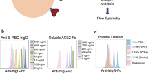 Ninety-six-well Immulon plates were coated with recombinant SARS-CoV-2 RBD protein from 293T cells (RBD) in PBS overnight at 4 °C. After blocking, 100-fold dilution of plasma samples were added to the protein-coated plate in 100 µL for 1 h at ambient temperature. Plasma samples were assayed in duplicate. Naive plasma samples were assayed along with the experimental samples. After three washes with PBS/0.05% Tween 20, recombinant human ACE2-AviTag (Acro biosystems; 40 ng/100 µL/well) followed by detection with an HRP-conjugated streptavidin (Jackson Immuno Research). After 1 h, plates were washed as before and OPD was added for 10 min. Absorbance was measured at 492 nm. Percent inhibition of ACE2 binding by the plasma was calculated based on the ACE2 binding in the absence of any plasma.