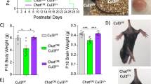 The brain tissues were homogenized in RIPA buffer (20 mmol/L TRIS-HCl pH = 7.5, 150 mmol/L NaCl, 1 mmol/L EDTA, 1% Triton X-100, 0.5% sodium deoxycholate, 0.1% SDS, 20 mmol/L NaF, and 1 mmol/L PMSF). Supernatants were collected after centrifugation for 10 min at 13,000×g. An aliquot of 40 µg total protein from each sample was run on 10% SDS/PAGE gels and transferred to a nitrocellulose membrane, which was then blocked with 5% nonfat milk in PBS (pH 7.4). The membranes were incubated with primary antibodies against ChAT (1:1000, AB144P, Millipore) or GAPDH (1:3000, Kangchen, China) at 4 °C overnight. Secondary antibodies conjugated with horseradish peroxidase against either goat or mouse IgG (1:3000, Multi Sciences, China) were performed for 2 h at room temperature and blots were exposed to ECL Western blotting detection reagents (Multi Sciences, China). Signals were acquired with a gel documentation system (Tanon 5200, China) and quantified with Image Pro Plus (version 6.0).
