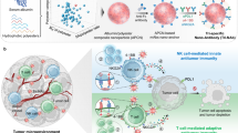 With the confirmation of the anti-melanoma effect, we further explored the general applicability of imNAαPD1 & αPDL1 using a murine 4T1 mammary tumor model, which emulates stage IV human breast cancer and is otherwise unresponsive to anti-PD1/PDL1 treatment33. Mice bearing orthotopic 4T1 tumors were treated as indicated above when the tumor volumes reached approximately 50 mm3 (Fig. 4k). At an equivalent injection dose, FreeαPD1 & αPDL1, NPαPD1 & NPαPDL1 exhibited marginal benefits in terms of tumor control (Fig. 4l). Encouragingly, imNAαPD1 & αPDL1-treated mice showed an enhanced response rate (Fig. 4l) and a reduced tumor growth rate (Fig. 4m) compared to the control treatment; meanwhile, the changes in body weight during treatment were within acceptable limits (Supplementary Fig. 23). Furthermore, the potential of imNAαPD1 & αPDL1 to eliminate circulating tumor cells and inhibit tumor metastasis was evaluated in a pulmonary metastatic model. Mice were intravenously injected with 4T1 cells expressing firefly luciferase (4T1-fLuc) and then received a q3dx3 course from the second day (Fig. 4n). From the in vivo and ex vivo bioluminescence imaging results, in mice treated with PBS, FreeαPD1 & αPDL1 and NPαPD1 & NPαPDL1, bioluminescence signals were evident on 16 days post-infusion, in contrast, mice treated with imNAαPD1 & αPDL1 exhibited the weakest bioluminescence signals (Fig. 4o, p). Direct observation of whole lungs and hematoxylin-eosin (H&E) staining verified the significant decrease in the number and size of metastatic nodules in the imNAαPD1 & αPDL1-treated group (Fig. 4q, and Supplementary Figs. 24, 25). The superior antimetastatic effects of imNAαPD1 & αPDL1 can be partly attributed to the imNAαPD1 & αPDL1-facilitated conjugation of CD8+ T cells and tumor cells in lung tissues and peripheral blood. Collectively, the enhanced antitumor efficacy of imNAαPD1 & αPDL1 in multiple tumor models indicated that imNA could extend the therapeutic potential of PD1/PDL1 blockade to a broader range of tumor types.
