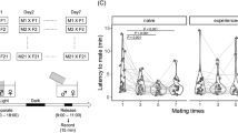 Heterozygous females and males of a csf1-KO strain (csf1+/∆11) were crossed. Genomic DNA was extracted from a fin clip of each progeny before sexual maturation, and the genotype of each fish was determined by a heteroduplex mobility assay as described above. To exclude the possibility that females choose familiar males with particular genotypes, individuals with different genotypes were reared together in a single 3-L tank: i.e., a single rearing tank contained one wild-type (csf1+/+) male, one wild-type (csf1+/+) female, one homozygous mutant (csf1∆11/∆11) male and one homozygous mutant (csf1∆11/∆11) female. Therefore, the tested females were familiar with both wild-type and mutant males. They were subjected to analysis of mating behavior at 6 months post hatching. One day before each mating experiment, a male and a female were randomly selected from the two different tanks and transferred to a small acrylic tank (200 mm length × 75 mm width × 150 mm height) consisting of black panels except for a transparent acrylic panel at the front face and filled with 2 L water at 26 °C. The tank was illuminated by a white LED light (LT-N10S-D, Ohm Electronic, Tokyo, Japan), whose light spectrum (Supplementary Fig. 17) and intensity (20.44 µmol m−2 s−1; 1387 Lux) were obtained using a light analyzer (LA-105, NK System, Osaka, Japan). The female was separated in a transparent plastic cup with small holes to exchange water. The next morning (at 7:00–8:00 AM), the behavioral trial was initiated by removing the cup. Their behavior was recorded for 2 h using the Raspberry Pi 3 modelB with the NoIR Camera Module V2 (Raspberry Pi Foundation, Cambridge, UK). After the trial, the fish were returned to their original tanks. Each female was tested with a wild-type male and a mutant male on different days in random order: each fish was tested only twice in total. Fish that did not spawn eggs during the 2 h-behavioral test were excluded from the subsequent analysis.
