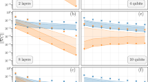 Here we describe the gradient-free optimization method used in our heuristics. First, we note that all the parameters in the ansatz are randomly initialized. Then, at each iteration, one solves the following sub-space search problem: \(\mathop{\min }\limits_{{\boldsymbol{s}}\in {{\mathbb{R}}}^{d}}C({\boldsymbol{\theta }}+{\boldsymbol{A}}\cdot {\boldsymbol{s}})\), where A is a randomly generated isometry, and s = (s1, …, sd) is a vector of coefficients to be optimized over. We used d = 10 in our simulations. Moreover, the training algorithm gradually increases the number of shots per cost-function evaluation. Initially, C is evaluated with 10 shots, and once the optimization reaches a plateau, the number of shots is increased by a factor of 3/2. This process is repeated until a termination condition on the value of C is achieved, or until we reach the maximum value of 105 shots per function evaluation. While this is a simple variable-shot approach, we remark that a more advanced variable-shot optimizer can be found in ref. 57.