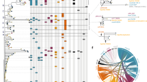 To increase the temporal resolution of plasmidome evolutionary trends over a time span of 1940–1985, 30 old isolates were included in the long-read Oxford Nanopore Technologies (ONT) sequencing scheme. Of these, seven isolates lacking plasmids were excluded from further analysis. Alignment-free k-mer-based clustering of the remaining 23 isolates by using Mashtree31 revealed a diverse genomic background, except for two indistinguishable pairs (Supplementary Fig. 7). In total, 45 plasmids were identified, one to four per isolate and varying in size from 2.2 to 123 kbp. K-mer presence/absence clustering of these plasmids revealed a large diversity (Supplementary Fig. 8; https://microreact.org/project/110-nP5qs). No clustering based on isolation years or presence of virulence genes was observed, although we identified putative virulence genes in 22/45 plasmids, earliest of which was from 1946. These included the aggregation substance asa1 and asa1-like, the cytolysin gene cluster and a bile salt hydrolase (bsh). Only three plasmids harboured ARGs, including E07284_3 (1960) encoding tetracycline resistance (tet(L)), E07292_2 (1962) encoding chloramphenicol resistance (cat), and E00740_3 (1985) encoding erythromycin (erm(B)), trimethoprim (drfC), bleomycin (ble) and two aminoglycoside resistance genes (aac(6′)-aph(2″) and aadD) (Fig. 4c). These depicted notably early emergence of antimicrobial resistance (AMR)-conferring traits in the E. faecalis population. In addition, plasmid E07292_2 (80 kbp, The Netherlands, 1962) also encoded genes annotated as bacteriocin, relA/B toxin/antitoxin system, and two gene clusters encoding for arsenical and mercury resistance. This region of ~20 kbp is identical to parts of plasmids from strains ATCC29212 (the UK, 1904, “CP008814 [https://www.ncbi.nlm.nih.gov/nuccore/CP008814.1/]”) and T2 (Japan, before 1992, “NZ_GG692853 [https://www.ncbi.nlm.nih.gov/nuccore/NZ_GG692853]”) (Supplementary Fig. 9). The isolate from 1904 contained no antibiotic resistance genes. Similarity analysis of the E07292_2 cat gene revealed 100% identity to cat from other E. faecalis strains and also E. faecium and different species of Staphylococci, suggesting interspecies exchange of genes.