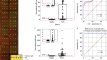 None of the seventy-nine negative control samples scored as positive in the HAT at a dilution of 1:40, thus providing 100% specificity in this set of samples. The HAT detected 131/153 (86% sensitivity) of the samples from PCR-diagnosed donors within the first 5 days of hospital admission, whereas the Siemens test detected 113/153 (74%). On day 5 the HAT detected 41/45 (91% sensitivity). Two samples had an endpoint greater than 11 doubling dilutions in the HAT, and required a repeat measurement spanning two plates. These two samples titrated to 13 doubling dilutions (1:163,840). Unmasking the samples revealed that both were acquired from an elderly lady with mild disease on days 3 and 5 of her admission. The range of positive titres detected by HAT was broad: 1–13 doubling dilutions (1:40–1:163,840). A correlation coefficient with the Siemens test could not be calculated as the latter has a ceiling score of 10 (Fig. 5B). A comparison of the two tests in a contingency table with cut-off of 1:40 (first doubling dilution) for HAT, and a score ≥ 1 for the Siemens test (as defined by the manufacturer), showed a strong correlation between the two tests for detection of antibodies to the RBD (P < 0.0001; two-tailed Fisher’s exact test, Fig. 5B). Overall, 52 of the 153 samples were from 24 donors with COVID-19 from whom repeated samples were taken on days 1, 3, or 5 of admission. The HAT detected a rise in agglutination titre over the first 5 days of admission in 16/24 (67%) of these patients (Table 1, Repeat in Supplementary Table 2). Reductions in titre were not detected.