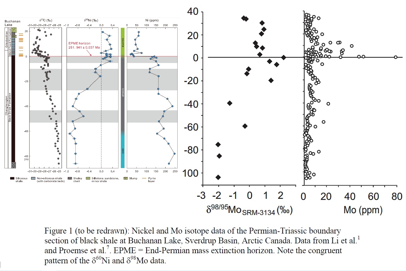 In their recent paper Li et al.1 studied Ni isotopes over a 100-m-thick black shale sequence of the Permian-Triassic boundary section at Buchanan Lake in the Sverdrup Basin, Canadian High Arctic. The deepest 60-m part of the stratigraphic section with oxic to anoxic depositional conditions has negative Ni isotope values in the range of -0.47 to -1.09 ‰ 60Ni, with a range in Ni content around 200 ppm, while the black shales up to the boundary have 60Ni values in the range of -0.20 to 0.33 ‰ (~150 ppm Ni), and the 20 m on top of the boundary have positive Ni isotope values up to 0.35 ‰ (~40 ppm Ni). The boundary likely corresponds to the end-Permian mass extinction event at about 252 Ma. The authors interpret their Ni and Ni isotope data as the impact of Ni-rich aerosol particles from the Siberian Traps volcanism.