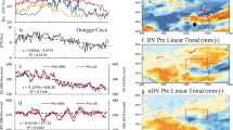 where \(\rho ( = 1000\,{\mathrm{kg}}/{\mathrm{m}}^3)\) is the density of soil moisture, H (=0.5 m) is the thickness of the upper layer soil, δSMi is the change of soil moisture over model integration interval of δt, \({{Rf}}_{{i}},\,{{Ep}}_{{i}},\,{{Tp}}_{{i}},\,{{Ro}}_{{i}},\,{\mathrm{and}}\,{{Gs}}_{{i}}\) are, respectively, rainfall, evaporation, plant transpiration, runoff, and internal gravity settling at the depth H, with i indicating the time step of model integration. Based on the vertical root profile of each plant type and their composition ratio, moisture pumping at depths is calculated for each plant as the sum in the upper 0.5-m layer as the plant transpiration Tp. The gravity settling Gs is then calculated at each time step from the equation above as the residual.