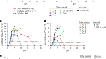 We conducted an experiment where ten healthy, adult rhesus macaques were challenged intramuscularly (i.m.) with a target dose of 1000 PFU of MARV (Angola variant). At 5 dpi, one cohort of animals (n = 5) received a 10 mg/kg intravenous (i.v.) loading dose of remdesivir, followed by 5 mg/kg daily maintenance doses 6–16 dpi, for a total of 12 consecutive days of treatment, as previously described31. A second cohort (n = 4) received a single 100 mg/kg i.v. dose of MR186-YTE 5 dpi. A single animal was treated with vehicle-only and served as the in-study positive control. The vehicle-treated control animal developed symptoms of MVD beginning 5 dpi and succumbed 7 dpi, consistent with the mean time to death (MTD) for historical controls (HC) challenged i.m. with the same seed stock and target dose of MARV (MTD = 7.95 ± 0.71 dpi; n = 19). All animals in the remdesivir-treated group developed mild to moderate clinical disease consistent with MVD, beginning with the appearance of fever 5–8 dpi and including decreased appetite/anorexia, petechial rash, and diarrhea in some or all animals (Supplementary Table 1 and Supplementary Fig. 1a), and 4/5 animals survived to the study endpoint (28 dpi) (Fig. 1a). All surviving animals were free of overt signs of MVD by 19 dpi. These results are consistent with a previous study demonstrating the efficacy of remdesivir in a cynomolgous macaque model of MARV disease31. Subjects in the MR186-YTE treated cohort exhibited considerably lower clinical scores (Supplementary Fig. 1b) and milder clinical signs of MVD than the control animal, primarily consisting of fever (Supplementary Table 1) and decreased appetite; a single animal (D5-MR-3) exhibited sparse petechial skin rash on 8 and 9 dpi (Supplementary Table 1). All subjects in this group were free of clinical signs by 16 dpi and all subjects survived to the study endpoint (28 dpi) demonstrating the effectiveness of MR186-YTE as a single dose therapeutic for the treatment of MVD (Fig. 1a). For statistical comparisons of survival, the in-study control animal was grouped with the 19 HC animals (n = 20, MTD = 7.90 ± 0.72 dpi). There was a significant difference in survival between the remdesivir treated group and the control cohort (Hochberg multiplicity-corrected p = 0.0004; Fisher’s exact test), and between the MR186-YTE treated group and the control cohort (Hochberg multiplicity-corrected p = 0.0002; Fisher’s exact test). All subjects regardless of treatment exhibited deviation from baseline hematological and serum analyte parameters, including lymphocytopenia, generalized granulocytosis (indicated by increased neutrophils with or without concurrent increases in eosinophils and basophils), thrombocytopenia, and increases in markers of liver injury (e.g., ALT, AST, GGT, ALP) and systemic inflammation (CRP) (Supplementary Table 1 and Supplementary Fig. 2). These changes were not markedly different between treated animals and the control animal prior to the initiation of treatment except for CRP, which was increased in the control animal compared to most animals from both treated groups at 5 dpi. Animals from both treatment groups exhibited a gradual return to baseline values for most parameters 8–14 dpi, indicating recovery. In summary, each therapeutic was demonstrated to be highly efficacious for treatment of MARV infected rhesus macaques on 5 dpi under their respective dosing regimen.