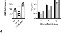 The involvement of these hypothetical proteins during the course of host cell infection was further assessed via a quantitative attachment, invasion, and intracellular replication assays (Supplementary Fig. 4d, Supplementary Table 1). The BPSL0097 and BPSS1860 mutants showed drastic decreases in attachment at 5 and 10% of wild type, respectively, while other mutants showed moderate defects in this process (Supplementary Table 1). The BPSL0636 mutant was the only strain to show a significant defect in invasion with a 75% decrease compared to wild type (Supplementary Table 1). Six mutants, BPSL0097, BPSL1126, BPSL1390, BPSL1422, BPSL2714, and BPSS0015, showed defects in intracellular replication between 2 and 6 h post infection, ranging from 17 to 75% wild-type replication while eight mutants, BPSL0097, BPSL0636, BPSL2714, BPSS0015, BPSS1265, BPSS1780, BPSS1818, and BPSS1860, showed 15–71% wild-type replication at 24 h post infection (Supplementary Fig. 4d, Supplementary Table 1). Significant defects were observed at 24 h post infection for the BPSL0097, BPSL2714, BPSS0015, BPSS1265, BPSS1780, BPSS1818, and BPSS1860 mutants (Supplementary Table 1). All 11 hypothetical genes have hundreds of orthologs in Burkholderia strains signifying that they may have conserved functions (Supplementary Table 1). In vitro growth and complementation analyses show that the defects during intracellular replication are not caused by reduced in vitro fitness or polar effect of these mutations, which validates these genes as virulence factors (Supplementary Fig. 5a-b).