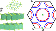To understand the detailed structure of the observed CDW order with the SOD, we constructed schematic atomic models of an SOD pattern (Fig. 1e) and a single SOD (Fig. 1f). In one single SOD, 13 Nb atoms were categorized as the central atom (Nb1), six at the nearest sites (Nb2), and the other six at the next nearest sites (Nb3). As shown in Fig. 1f, the central Nb atom is superimposed by its \(d_{z^2}\) orbital, whereas the other surrounding Nb atoms contract towards the central Nb1 and give rise to the fluctuation in the top Se plane21. The 12 Se atoms in the SOD unit were categorized into two groups: six Se atoms in the topmost plane (labeled by brown circles), and the other six in the bottom plane (labeled by light brown circles). The six topmost Se atoms contributed more to STM imaging and resulted in triangular protrusions in the SOD unit, as shown in Fig. 1c.
