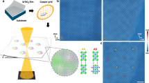 (PTO)n/(STO)m superlattice heterostructures were grown via PLD (PLD-5000) equipped with a KrF excimer laser (λ = 248 nm)22. Heterostructures were deposited on (110)-DyScO3 substrates by alternately ablating ceramic targets of SrTiO3 and Pb1.1TiO3 at a laser energy of 340 mJ pulse−1, and a laser repetition rate of 10 Hz. The substrate was heated to 600 °C in a dynamic oxygen pressure of 200 mtorr for the growth of the PTO and STO layers. Thicknesses of the PTO and STO layers were held at desired thickness through controlling the number of laser pulse. Following growth, the (PTO)n/(STO)m superlattice heterostructures were cooled to room temperature in 200 mtorr oxygen pressure at 10 °C min−1.