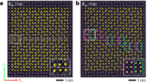 The dark field TEM image shown in Fig. 2b was carried out under the two-beam condition with g vector: g = 002pc from an aberration-corrected FEI Titan Themis G2 at 300 kV. HAADF and iDPC images were also recorded at 300 kV using an aberration-corrected FEI Titan Themis G2. The convergence semiangle for imaging is 30 mrad, the collection semiangles snap is 4–21 mrad for the iDPC imaging, and 39–200 mrad for the HAADF. The atom positions were determined by simultaneously fitting with two-dimensional Gaussian peaks using a MATLAB code32. The polar vectors in Fig. 2e were plotted from the offset between A site (Pb and Sr) and B site (Ti) sublattices based on the HAADF-STEM image in Fig. 2d. To determine the atomic shift for each atom column in the HAADF, the displacements of A (B) with respect to the center of their surrounding four B (A) columns are measured and decomposed into in-plane and out-of-plane components, respectively. For the iDPC image along [010] direction (Fig. 3a), each cation column [Pb(Sr)] and TiO is surrounded by four oxygen columns. The displacements of cations with respect to the center of their surrounding four oxygen columns can be measured along in-plane and out-of-plane directions, receptively (Supplementary Figs. 6 and 7). Based on the displacements, the unit-scale polarization (Fig. 3b, e and Supplementary Fig. 7g) can be calculated according to Ps = \(\frac{1}{V}{\sum} {\delta _iZ_i}\)38, where V is the volume of u.c. which for our case is a2c, δ is displacement/shift of atom (i) from their centrosymmetric position, and Z is the Born effective charge of atom (i) calculated by ab initio theory, 6.71 for Ti, 3.92 for Pb, −2.56 for O in PTO, and 7.12 for Ti, 2.54 for Sr, −2.00 for O in STO38. Taking the oxygen sublattice as the reference (standard position of each u.c.), the polarization is simplified to be Ps = \(\frac{1}{V}( {\delta _{Pb\left( {Sr} \right) - O}Z_{Pb\left( {Sr} \right) - O} + \delta _{Ti - O}Z_{Ti - O}} )\). The vector and magnitude maps of displacement (Fig. 2e) and polarization (Fig. 3b) are plotted by Origin.
