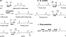 The second well-studied mechanism by which the pimeloyl moiety is generated, involves the “BioI-BioW” pathway of Bacillus subtilis and its relatives17,28,29,30. Among them, the cytochrome P450 enzyme BioI in Bacillus, cleaves a specific carbon–carbon bond (C7–C8) of long chain acyl-ACP to liberate an equivalent of pimelic acid29,31. Complex structures of BioI liganded with different acyl-ACPs illustrate how fatty acyl chains are shaped into a “U-turn” above the heme iron cofactor within the enzyme active site30. BioW of Bacillus acts as a pimeloyl-CoA synthetase28,32, converting free pimelic acids into the thioester of pimeloyl-CoA via an ATP-dependent mechanism17. Crystal structures of BioW enzymes from B. subtilis33 and Aquifex aeolicus34 provided mechanistic insights into the ligation of coenzyme A (CoA) with pimelic acid. 13C-labeling experiments by Manandhar and Cronan17 supplemented in vivo evidence that free pimelate also originates from the FAS II pathway in B. subtilis. In contrast to pimeloyl-ACP being preferentially used by the E. coli BioF as a substrate13,20,35, pimeloyl-CoA is exclusively utilized by the B. subtilis BioF as a bona fide precursor of biotin synthesis18. Therefore, the “BioI-BioW” pathway of B. subtilis represents a unique earlier route committed to pimelate production30,33, which is far distinct from the “BioC-BioH” route in E. coli20,22.