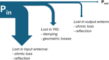 We use micromagnetic simulations to study spin-wave transmission across the two interfaces of the resonator structure (Supplementary Fig. 7). Multiple internal reflections are avoided in this analysis by using a 50-μm-wide CoFeB stripe. For spin waves converting from the λ1 to the λ2 mode (incoming waves) or vice versa (outgoing waves), we estimate transmission coefficients t12 = 1 and t21 = 0.5, respectively. The quantitative assessment of transmissions involving λ1 and λ3 modes is complicated by a difference in wave localization and spin-wave ellipticity (\(\epsilon =1-{m}_{\min }/{m}_{\max }\))33. While the wave profiles of the λ1 and λ2 modes are approximately uniform across the YIG film thickness, the short-wavelength λ3 mode localizes at the top surface. Also, λ1 and λ2 waves are elliptical along x (ϵ = 0.8), whereas the λ3 mode near the top surface is elliptical along z (ϵ = 0.3). Efficient transmission of spin waves across single interfaces for some of the mode conversions may be attributed to backscattering immunity, an effect that is prominent for DE spin waves inside the volume-mode gap34,35. We note that stronger spin-wave reflection at other interfaces does not contradict low-loss spin-wave transmission across nanoresonators at allowed frequencies (Figs. 1 and 2). Analogous to an optical Fabry–Pérot resonator, multiple internal reflections and constructive interference between incoming and circulating spin waves produces high transmission even if the reflection coefficients of the two interfaces are non-zero. This conclusion is supported by a comparison of phase-resolved TR-MOKE microscopy maps and model calculations using incoming, reflected, and outgoing spin waves (Supplementary Fig. 8). For a 730-nm-wide resonator, we find a total transmission T = 0.92 at an allowed frequency of 1.76 GHz. Moreover, because the experimental data and calculations only agree when the absorption coefficient is set close to zero, the energy loss caused by dipolar coupling to CoFeB is small in the nanoscale resonator.