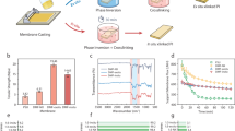 The PWP of the substrate was measured at a transmembrane pressure of 1 bar using a conventional ultrafiltration (UF) setup. The PWP and salt rejection of the PES-TFC membranes were evaluated by employing a RO setup as described elsewhere29,56. To avoid the break of membranes, PES-TFC membranes fabricated from substrates with condition A (e.g., the dope/bore fluid flow rate = 1) were conditioned and tested at low pressures in the range of 10–20 bar. Unless stated otherwise, the PWP of all other PES-TFC membranes were conditioned at 30 bar for about half an hour and measured at 20 bar and about 25 °C.