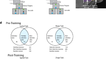 Head-fixed animals sat in a custom-designed monkey chair (Crist Instrument, Hagerstown, Maryland) with an open front to allow unimpaired reaching movements with both arms. Visual stimuli were back-projected by an LCD projector onto a translucent plexiglass screen mounted vertically, approximately 40 cm in front of the animal. Supplementary Fig. 1 shows the touch screen in schematic form. The eight target positions on the screen were organized in a rectangle centered on the fixation point, each target ~ 8 cm (11 deg of visual angle) from the center fixation point. A small piece of plexiglass (2 in × 3/8 in) oriented in the sagittal plane was mounted on the front of the projection screen to bisect the touching surface at each target location (one plexiglass piece per target). Touches were monitored every 2 ms using 16 capacitive sensors, mounted on the back of the screen, with one sensor on each side of each of the 8 possible target locations (to sense reach endpoints) and one sensor at each of the two home pads (to sense reach starting positions). The animals were trained to reach with the left hand to the left side of the plexiglass divider and with the right hand to the right side of the divider so that each hand activated a unique capacitive sensor, even when both hands reached to the same target (Supplementary Fig. 1). Eye position was monitored using the 120 Hz ISCAN eye-tracking laboratory (ETL-400). Animals were monitored in the testing room at all times using an infrared camera equipped with an infrared illuminator.