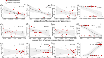 The traditional way of comparing inbreeding depression among studies is to quantify the inbreeding load in terms of lethal equivalents, i.e. a group of genes that would cause on average one death if dispersed in different individuals and made homozygous59. However, differences in statistical methodology and inbreeding measures make it difficult to compare the strength of inbreeding depression in terms of lethal equivalents among studies60. Here, we used the approach suggested by Nietlisbach et al.60 and refitted the survival animal model with a Poisson distribution and a logarithmic link function. We were interested in lethal equivalents for the overall strength of inbreeding depression rather than its lifetime dynamics, so we fitted a slightly simplified animal model with FROH, age, age2, twin and sex as fixed effects and birth year, capture year, individual id and pedigree relatedness as random effects. The slope of FROH estimates the decrease in survival due to a 10% increase in FROH, so we calculated the number of diploid lethal equivalents 2B as –(ßFROH)/0.10 \(*\) 2 where ßFROH is the Poisson model slope for FROH.