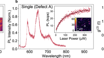To quantify the AS excitation efficiency, we use the ratio IAS/IS of AS (IAS) to Stokes (IS) excited counts20. A summary of the Stokes and AS excited counts as a function of the temperature is plotted in the lower panel in Fig. 1e. The Stokes excited count IS is almost constant for temperatures varying from 11 to 300 K but declines rapidly as the temperature rises to 500 K. In comparison, when the temperature rises from 11 to 300 K, the AS excitation counts IAS increase slowly and then increase rapidly as the temperature rises to 500 K. The ratio IAS/IS increases slowly as the temperature increase to 300 K, which is shown in the upper panel in Fig. 1e. At room temperature, IAS/IS is around 0.57%, which is approximately 50 times the ratio for NV centers in diamond20. IAS/IS can be further increased using a shorter wavelength of AS excited laser20,21. In addition, IAS/IS increases to 10.4% at 500 K, which is comparable with the silicon vacancy and germanium vacancy in diamond at room temperature20. The dramatic increase in the behavior of IAS/IS at elevated temperatures will be useful for all-optical high temperature sensing20. Combined with SiC nano-particles32, nanoscale temperature sensors usable in living cells and microelectronic systems can be constructed. Through manufacturing photonics structures such as solid immersion lenses10 and so on, it is possible to realize AS excitation of a single VSi defect20. We further investigated the stability of PL under AS excitation at various temperatures. Figure 1f displays the results with five representative temperatures, with all of the counts stable for these temperatures. We also note that the low PL photon counts for the AS approach would limit the application by employing only single emitters, while the quantum-sensing sensitivity can be dramatically increased by a factor of \(\sqrt{N}\), where N is the number of the color centers33. Ensemble color centers would be useful for high-sensitivity quantum sensing.
