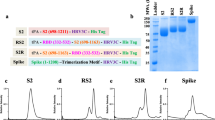 The pCAGGS plasmid encoding the receptor-binding domain (RBD) of SARS-CoV-2 was kindly provided by F. Krammer43. RBDs of SARS-CoV-2 variants of concern were generated by PCR amplification of fragments from wild-type DNA template followed by fusion PCRs to introduce described mutation N501Y for the UK variant and additional mutations K417N and E484K for the South African variant28,44. Forward primer RBDfor and reverse primer N501Yrev were used for amplification of fragment 1, forward primer N501Yfor and reverse primer RBDrev were used for amplification of fragment 2. Both fragments containing an overlap sequence at the 3′ and 5′ end were fused by an additional PCR using forward primer RBDfor and RBDrev. Based on cDNA for the UK variant, additional mutations of the South African Variant were introduced by PCR amplification of three fragments using forward primer RBD-for and reverse primer K417Nrev, forward primer K417Nfor and reverse primer E484Krev, forward primer E484Kfor and reverse primer RBDrev. Amplified fragments were assembled by subsequent fusion PCR using forward primer RBDfor and RBDrev. RBD mutation L452R as recently reported for the SARS-CoV-2 variant of concern identified in Southern California (referred to in this manuscript as “LA”), was introduced using primer RBD-for and reverse primer L452Rrev for amplification of fragment 1 and forward primer L452Rfor for fragment 2. Both fragments were subsequently fused using primers RBDfor and RBDrev. DNA coding for mutant RBDs (amino acids 319–541 of respective spike proteins) was cloned into Esp3I and EcoRI site of pCDNA3.4 expression vector with the N-terminal signal peptide (MGWTLVFLFLLSVTAGVHS) for the secretory pathway that comprises Esp3I site. All expression constructs were verified by sequence analysis. A full list of primers used in this study can be found in Supplementary Table 3. Confirmed constructs were expressed in Expi293 cells33. Briefly, cells were cultivated (37 °C, 125 rpm, 8% (v/v) CO2) to a density of 5.5 × 106 cells/mL, diluted with Expi293F expression medium and transfection of the corresponding plasmids (1 µg/mL) with expifectamine as per the manufacturer’s instructions. 20 h post transfection enhancers were added as per the manufacturer’s instructions. Cell suspensions were then cultivated for 2–5 days (37 °C, 125 rpm, 8 % (v/v) CO2) and then centrifuged (4 °C, 23,900×g, 20 min) to clarify the supernatant. Supernatants were then filtered with a 0.22-µm membrane (Millipore, Darmstadt, Germany) and supplemented with His-A buffer stock solution (20 mM Na2HPO4, 300 mM NaCl, 20 mM imidazole, pH 7.4). The solution was then applied to a HisTrap FF crude column on an Äkta pure system (GE Healthcare, Freiburg, Germany), extensively washed with His-A buffer, and eluted with an imidazole gradient (50–400 mM). Eluted proteins were dialyzed against PBS.