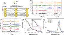 We used the ligand cation 4-vinylbenzylammonium bromide (VBABr, Fig. 1b), which we have shown forms 2D/3D interfaces with RDPs that exhibit strong diffraction, and greatly improves the efficiency and stability of photovoltaic devices10,12. To obtain q values for the diffraction peaks of low-n RDPs, we first spin-coated thin films of \(\left\langle n\right\rangle\) = 1, 2, and 3 directly from RDP precursor solutions using the composition (VBABr)2(FA0.95MA0.05)n−1Pbn(I0.95Br0.05)3n+1, which has the same cation and anion composition as the 2D/3D films used throughout this work. X-ray diffraction (XRD) patterns for these films are shown in Fig. 1c. The (001) diffraction peaks of n = 1 and 2 were found to have q = 0.37 Å−1 and 0.29/0.30 Å−1, respectively, while an (001) n = 3 peak could not be observed for these samples. The n = 2 peak experiences a small shift in the \(\left\langle n\right\rangle\) = 3 film, possibly due to strain. These q values are similar for analogous films using the MA- and iodine-only composition (VBABr)2MAn−1PbnI3n+1 (Supplementary Fig. 1), indicating that the RDPs with multication and multianion composition have minimal shifting of their characteristic (001) diffraction peaks. The diffraction peak positions we observe for n = 1 and 2 are also very similar to those we have previously measured and simulated for RDPs using the ligand phenethylammonium, PEA (owing to the structural similarity of PEA and VBA)21, where we found n = 3 PEA RDPs to diffract at q = 0.22 Å. We assume a similar peak for the n = 3 VBA RDPs here.