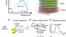 Finally, Figs. 6d and 6e benchmark responsivity and D* values vs speed respectively, for the WSe2 phototransistor reported in this work with other single 2D material-based (such as MoS2, MoSe2, WSe2, InSe, SnS2, etc.) phototransistors that report the values of all three parameters (R, D* and τf). A clear trade-off between R and τf is observed over a wide range of R (10−3 A/W to 105 A/W) and τf (μs to seconds) (Fig. 6d)10,11,28,29,30,31,32,33,34,35,36,37,38,39,40,41,42,43,44,45,46. When R is high, τf also tends to be very high10,28 indicating slow detector speed. On the other hand, fast speed (low τf) phototransistors show lower R37,40. Our work shows the benefit of high R without slowing down the phototransistor by employing a lateral p–n homojunction. Figure 6e benchmarks both flicker noise- and shot noise-limited (theoretical maximum) D* vs τf values for the same set of reports as shown in Fig. 6d. With high flicker noise-limited (1.1 × 1012 Jones) and shot noise-limited (5 × 1013 Jones) D*, high R (94 A/W) and low τf (14 μs) data, this work reports one of the best combination of R, D* and τf values, enabled by a lateral p–n junction.