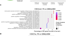 Hierarchical clustering of samples with H3K4me3 marks in promoters shows a noticeable difference between PA and DA/GB gliomas (Fig. 5A). The majority of the PA samples exhibited large pairwise overlap of H3K4me3 marked promoters (0.93–0.95), while the pairwise overlap between PA samples and DA/GB gliomas was lower. In addition, the group of DA/GB tumors showed relatively lower similarity among them. We identified 359 genes with the promoters differentially marked with H3K4me3 between the five PA samples forming the tight cluster, and DA/GB gliomas. The vast majority of them (338 out of 359) had the active chromatin mark in their promoters only in PA samples (Supplementary Table 4) and were characterized by a significant increase in the mRNA levels (Fig. 5B), H3K27ac and ATAC-seq signal intensity in PA samples in comparison to DA/GB samples (Supplementary Fig. 5A, B).