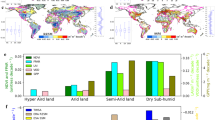 To evaluate the robustness of our analysis, we used different moving windows, tested the impacts of long-term NDVI trends, tested the trends in sub-periods of the growing season, examined croplands separately, used different vegetation growth indicators, used water availability indicators at different time scales, and used a different water availability indicator (soil moisture) to re-conduct our spatiotemporal analysis. In addition to results based on a 5-year moving window (Fig. 2), we used 10-year and 15-year moving windows to evaluate the trends. The spatiotemporal trends in RNDVI-SPEI03 and RNDVI-scPDSI obtained using the 10-year and 15-year moving windows (Supplementary Fig. 2) showed great consistency with those from the 5-year moving window analysis (Fig. 2a–d). To examine whether the observed trends of productivity-moisture correlations were caused by the long-term NDVI trend, we detrended NDVI using both linear and nonlinear (moving average) methods and re-conducted our analyses on spatiotemporal trends of RNDVI-SPEI03 and RNDVI-scPDSI. The results (Supplementary Fig. 3) showed great consistency with those from the non-detrended analysis (Fig. 2a–d), indicating that the observed trends of productivity-moisture correlations were not caused by the long-term NDVI trend. To examine whether the shrinking of water surplus and the increasing water deficit trends occurred in different sub-periods of the growing season, we examined the spatiotemporal productivity-moisture relationship for three sub-periods: April–June, June–August, and August–October. The temporal trends of significant changes (p < 0.05) in percentage areas associated with water deficit and water surplus responses for these three sub-periods (Supplementary Fig. 4) showed that the shrinking of water surplus and expansion of water deficit occurred in most of the sub-periods, except for the shrinking water surplus, which was not significant in the April–June sub-period (p > 0.05 for Blue line trend in Supplementary Fig. 4a and d). It is likely because the increasing snowpack melting exacerbated water surplus in the spring. Interestingly, croplands showed increasing water constraint as well, except for irrigated croplands46 (which only account for around 11% of all the grid cells in the study area (Supplementary Fig. 5). In addition to NDVI, we also used the VOD from 1988 to 2015, MODIS EVI, SIF, and GPP from 2000 to 2015 and GIMMS3g GPP from 1982 to 201147 as vegetation growth indicators. Specifically, we evaluated to what extent the changes in the relationship between vegetation growth and water availability indices (SPEI03 and scPDSI) detected using NDVI were also consistently found with these other productivity indicators (i.e., VOD, SIF, EVI, and GPP). Our results showed comparable patterns of the changing correlations across all combinations of vegetation growth indicators and water availability indices. The trends of RVOD-SPEI03 and RVOD-scPDSI (1982-2011), RSIF-SPEI03, REVI-SPEI03, RGPP-SPEI03, RSIF-scPDSI, REVI-scPDSI, and RGPP-scPDSI (2000–2015) were all comparable to the patterns of RNDVI-SPEI03 and RNDVI-scPDSI (1988–2015) for the overlapping periods (Supplementary Fig. 6). To support the analysis based on 3-month time-scale of SPEI (SPEI03) as water availability indicator, we re-calculated the spatiotemporal vegetation-SPEI correlations based on SPEIs at all time-scales ranging from 1 to 24 months (SPEI01-SPEI24) as water availability indicators. The significant negative and positive trends in the correlation between NDVI anomaly and SPEI (p < 0.05) were confirmed at all time-scales ranging from 1 to 24 months (Supplementary Fig. 7). In addition to SPEI and scPDSI, we also used European Space Agency (ESA) Climate Change Initiative (CCI) program based soil moisture as water availability indicator to evaluate the robustness of spatiotemporal trends of RNDVI-SPEI03 and RNDVI-scPDSI. The spatiotemporal relationship between vegetation growth and soil moisture (RNDVI-SM) showed comparable patterns to the ones found using SPEI and scPDSI as water availability indicators (Supplementary Fig. 8).