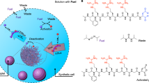 ATP-based coacervates have previously been studied as dynamic membrane-less protocells compatible with growth, enzymatic reactions, and RNA partitioning21,22. Inspired by the phosphorylation-mediated liquid–liquid phase separation of peptides and RNA developed by the group of Keating23, our group achieved reversible ATP-poly-l-lysine coacervates with the introduction of pyruvate kinase (PyK) to generate ATP in situ from ADP and phosphoenolpyruvate (PEP)19. With the high efficiency of the PyK reaction and lack of side reactions that can overcomplicate nonenzymatic systems, we hypothesized we could achieve enough control of coacervation to obtain a coordinated behaviour like growth (see scheme in Fig. 1). In comparison to our previous work, we replaced poly-l-lysine with K72 as a cationic fluorescent protein, which has already been used to form droplets with RNA24. K72 contains 72 repeats of the pentapeptide VPGKG (an elastin-like sequence)25,26 and is labeled with green fluorescent protein (GFP). It can form condensates at low concentrations with ATP, which can be easily monitored by fluorescence microscopy.