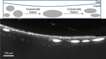 Coacervate droplets form spontaneously by phase separation in a saturated solution of macromolecules; when the phase separation is driven by attractive electrostatic interactions, they are called complex coacervates. Coacervates lack a membrane and thus have no physical barrier that limits their growth. The droplets are permeable to molecules from the surroundings with some selectivity, and concentrate the solutes through dynamic interactions, opening the way for their building blocks to be synthesized in situ12. As coacervate droplets are formed by liquid–liquid phase separation, they are in principle governed by the equilibrium concentrations of the building blocks, and when more material is supplied, the volume of the coacervate phase can grow while the overall internal concentration remains approximately constant. This perfectly aligns with the active droplet requirements and is crucial given that most protocell models so far have increased in size via passive mechanisms: vesicle fusion13, droplet coalescence and ripening14,15, or uptake of externally added building blocks16.