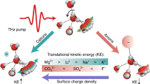 Figure 1a shows typical time-of-flight (TOF) spectra of ions emitted from the surfaces of nanoparticles. Identifying the origin of the aforementioned ions was enabled by using the reaction nanoscopy method detailed in the “Methods” section. The TOF measurements show the formation of \({\mathrm{H}}_{3}^{+}\) in addition to \({\mathrm{H}}^{+}\) and \({\mathrm{H}}_{2}^{+}\) ions. In addition, Fig. 1a shows that the formation of \({\mathrm{H}}_{3}^{+}\) ions is nanoparticle-size independent. Although our TOF spectrometry succeeds in confirming the creation of the trihydrogen cation from water molecules adsorbed on the nanoparticle surfaces, the exact source of \({\mathrm{H}}_{3}^{+}\) remains ambiguous as the silica nanoparticles’ surfaces used in our experiments are inhabited by silanol groups in addition to water. As such, the production of \({\mathrm{H}}_{3}^{+}\) may be a result of either water, silanol, or both. Therefore, to unambiguously identify the source of \({\mathrm{H}}_{3}^{+}\) cations, we performed a different set of measurements with parameters identical to those mentioned above but using an isotopolog of water, namely\({\mathrm{D}}_{2}{\mathrm{O}}\). Substituting hydrogen by its isotope is a critical step in the process of identifying the exact origin of the trihydrogen cations, as the existence of deuterium is constrained to the heavy water molecules adsorbed on the nanoparticles’ surfaces and cannot be found in silanol or any other constituents in our vacuum chamber. Figure 1b shows a comparison between the TOF spectra of 100 nm silica nanoparticles suspended in \({\mathrm{D}}_{2}{\mathrm{O}}\) and \({\mathrm{H}}_{2}{\mathrm{O}}\). The observation of \({\mathrm{D}}_{3}^{+}\) when \({\mathrm{D}}_{2}{\mathrm{O}}\) is used as a suspension solution is unequivocal evidence in support of the formation from water adsorbed on the nanoparticle surface. Moreover, the existence of \({\mathrm{HD}}_{2}^{+}\) in the TOF spectrum provides further confirmation, as it can only be produced when a \({\mathrm{D}}_{2}\) moiety is formed through a migration mechanism in a single \({\mathrm{D}}_{2}{\mathrm{O}}\) molecule followed by the abstraction of a proton from a neighboring silanol ion.