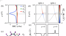The above discussions have shown the Dirac cone at \({{\boldsymbol{K}}}_{{\boldsymbol{+}}}\) carries only upward spins, while the other one at \({{\boldsymbol{K}}}_{{\boldsymbol{-}}}\) has downward spins (see Fig. 2b and the inset to Fig. 2a). Although this shares some similarity with the spin-valley locking of the monolayers group-VI TMDCs1,2,3,4,5,6, the spin-valley locking in BaMnSb2 exhibits several distinct features. First, the SOC-induced spin splitting at each valley (~0.35 eV) is much larger than the energy gap of Dirac cones (~50 meV) in BaMnSb2, while the TMDC monolayer (e.g., MoS2) is in the opposite limit, with the energy gap (~2 eV) being much larger than the SOC-induced spin splitting (~0.15–0.46 eV for the valence band)1,11,14,15,16. The smaller band gap of Dirac cones compared to the SOC strength in our system implies that the Berry curvature for spin-up state (spin-down state) is more concentrated around the \({{\boldsymbol{K}}}_{{\boldsymbol{+}}}\) (\({{\boldsymbol{K}}}_{{\boldsymbol{-}}}\)) valley, which can possibly lead to a more strongly coupled valley-spin Hall effect, as compared to TMDC monolayers and bulk 3R-MoS211. Second, the smaller band gap around tens of meV in BaMnSb2 suggests that the optical probe of valley-spin physics will appear in THz frequency regime, rather than the visible light regime. In addition, thanks to the weak interlayer tunneling (see Supplementary Note 4), the valley-spin locking remains in bulk single crystals, contrasted with TMDC materials where the presence of inversion symmetry in bulk material (2H phase) or the films with even number of layers obliterates the valley-spin physics. Finally, the smaller Dirac gap also suggests that the system is close to a topological phase transition and recent theory has suggested that the piezoelectric coefficient varies discontinuously across this transition32. Thus, BaMnSb2 will provide a material platform to test this theoretical prediction. Therefore, BaMnSb2 offers a rare opportunity to explore novel spin-valley locking physics, as well as topological phase transition, in bulk materials.